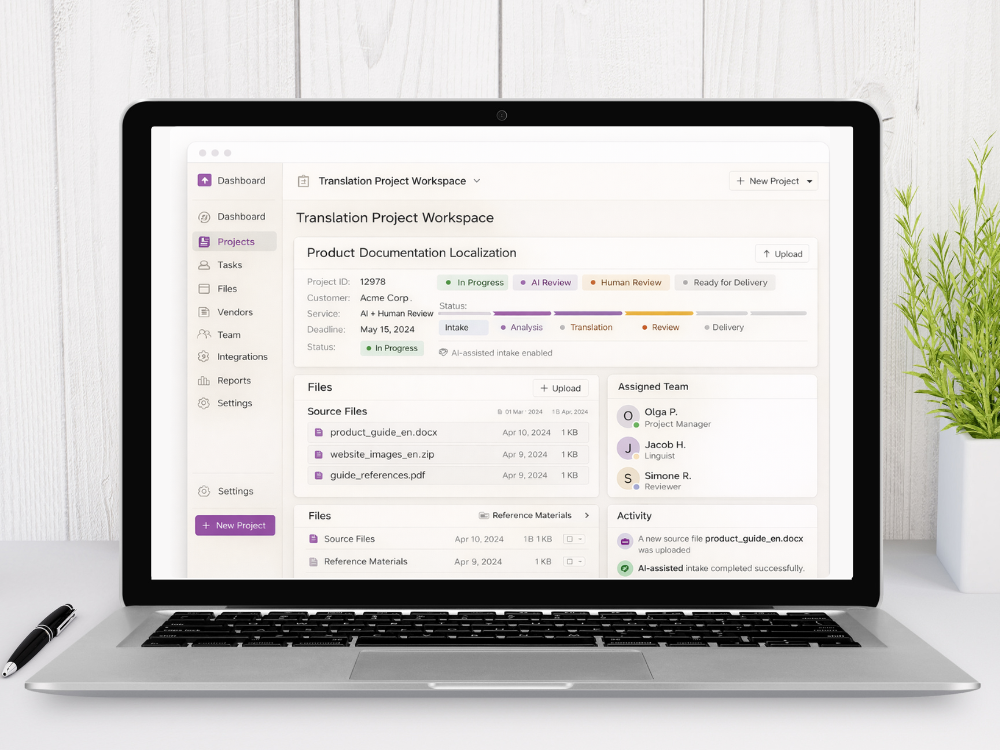 The solution was designed to improve control and consistency across project intake, multilingual task coordination, file handling, notifications, and role-based collaboration. The system design included template-based project setup, automatic metadata population, centralized project file storage, configurable workflow actions, simplified invoicing logic, controlled access by role, and a lightweight client portal for direct file submission and delivery tracking. It was also planned to support AI-assisted extraction of project details from emails and provide a stronger integration layer for existing translation tools and client-facing workflows.